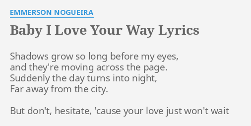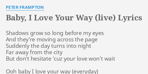 But dont hesitate cause your love wont wait hey. For the Will To Power song see Baby I Love Your WayFreebird Medley. Clouds are stalking islands in the sun. From the album Frampton and Frampton Comes Alive. Shadows grow so long before my eyes And theyre moving across the page Suddenly the day turns into night Far away from the. Oh baby I love your way everyday Wanna tell you I love your way Wanna be with you night and day Moon appears to shine and light the sky With the help of some firefly Wonder how they have the. Wish I could dry one out of season.